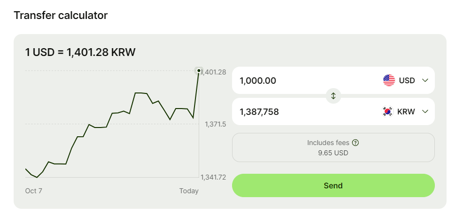 Wise는 미국에서 한국으로 저렴하고 빠르게 송금할 수 있는 인기 있는 앱 중 하나입니다. 기본적으로 Wise는 실시간 환율을 제공하고, 수수료가 투명하게 공개되어 있어 사용자가 미리 송금 비용을 쉽게 확인할 수 있습니다.