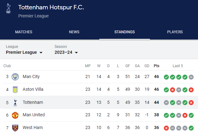 토트넘은 최근 현재 5위를 달리고 있습니다. 손흥민 선수가 아시안컵 일정으로 빠진 가운데 히샬리숑이 잘 해주고 있지만, 아쉽게 최근 5경기 2승밖에 못 올렸습니다. 아시안컵 우승을 하고 돌아와서 리그에서도 좋은 성적을 냈으면 좋겠네요.