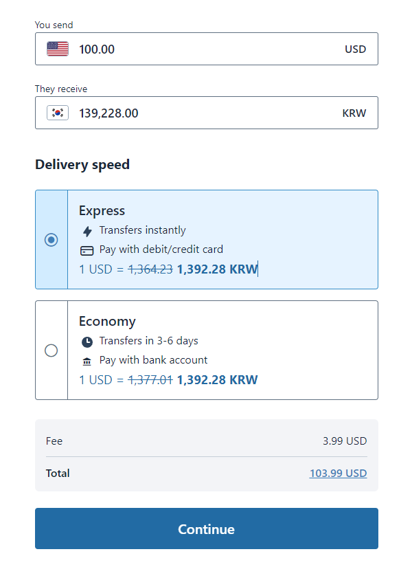 송금 옵션 선택: Express 또는 Economy 중 하나를 선택합니다.